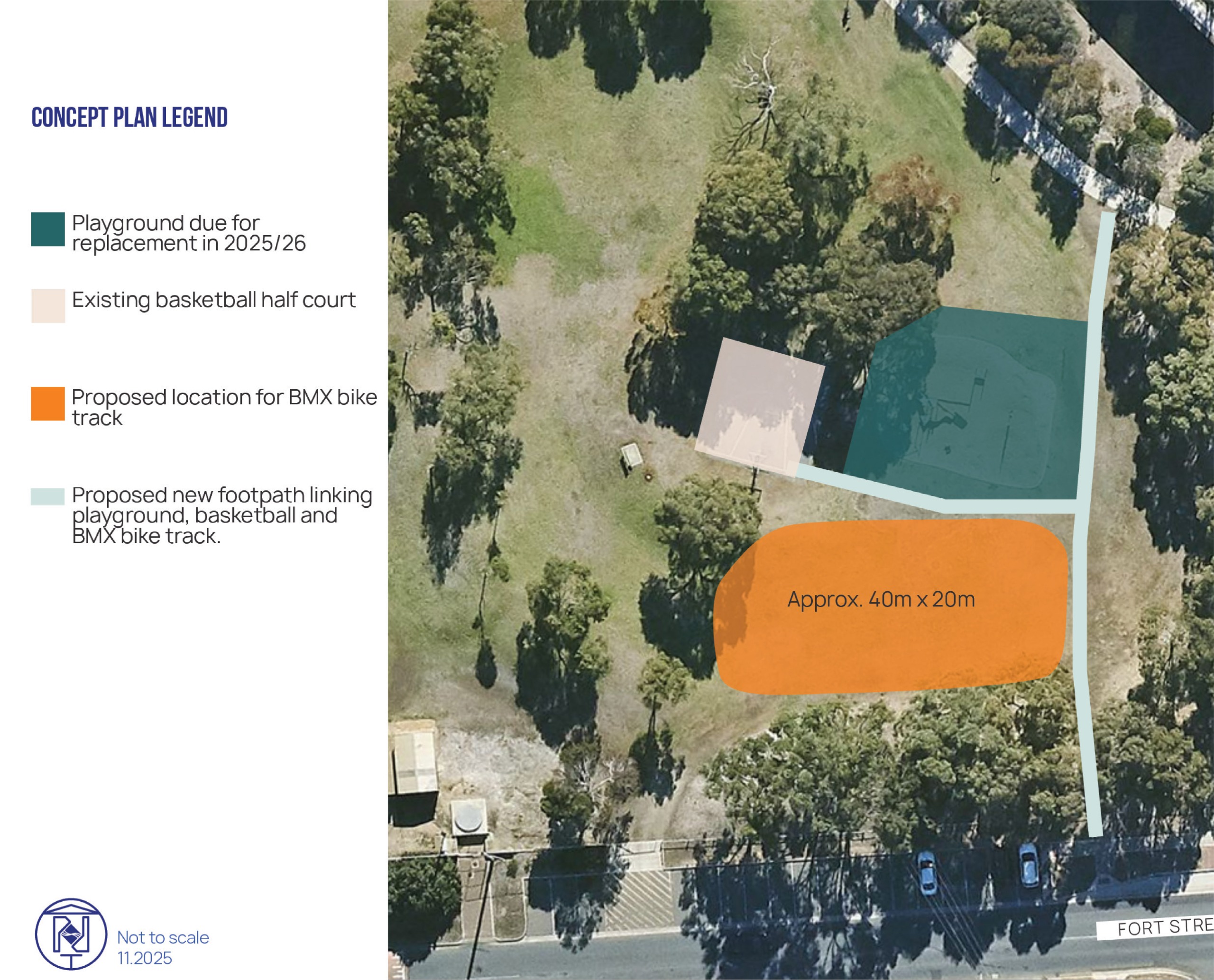 The BMX Track is proposed to be located in the south-eastern corner of Grange Recreation Reserve, adjacent Fort Street and near the existing basketball half court and playground.