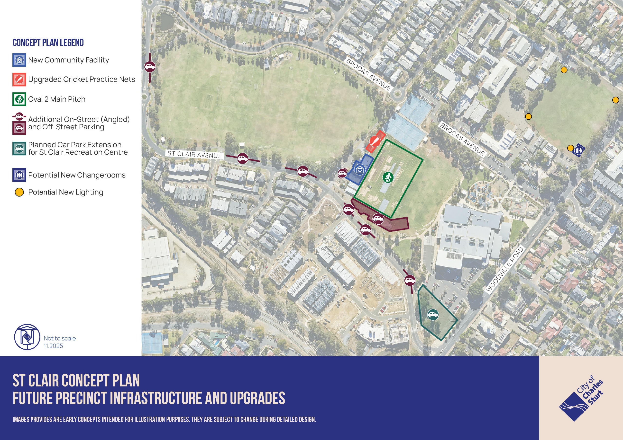 The City of Charles Sturt received a State Government election pledge of $1.5m to make improvements to the St Clair oval precinct following the 2022 state election. This included the construction of a new community facility.